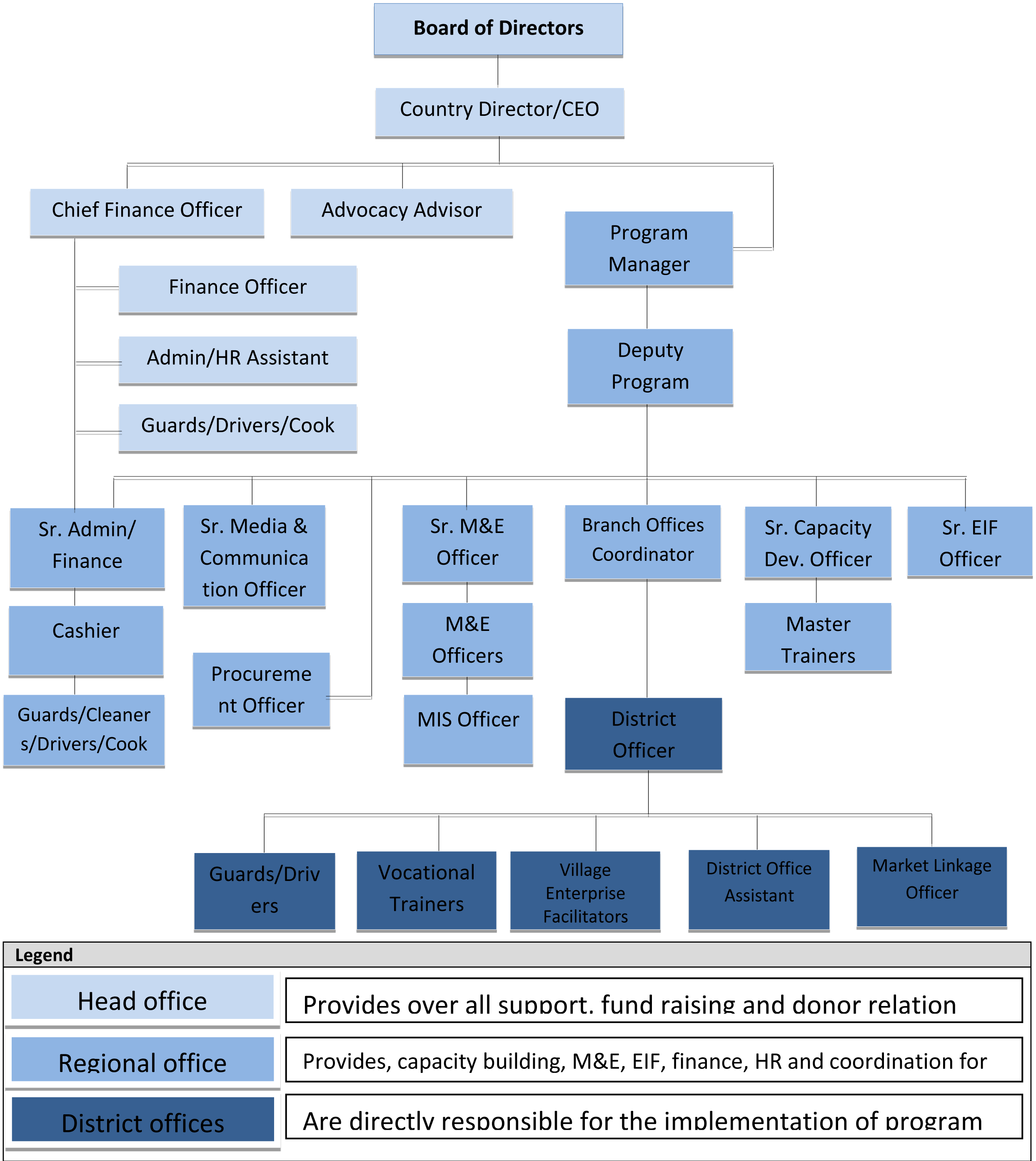 The overall operation of Hand in Hand Afghanistan is managed by Chief Executive Officer/Country Director in close cooperation with Program Manager, Chief Finance Officer, Branch Offices Coordinator, Sr. Capacity Development Officer and Sr. Monitoring and Evaluation Officer.
